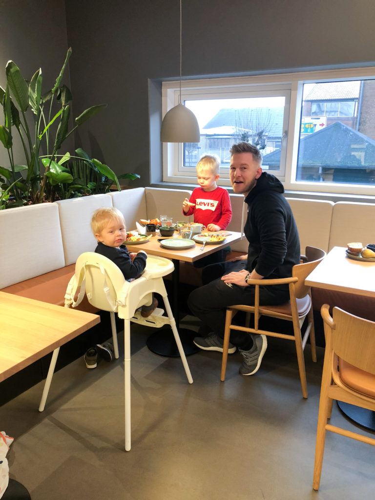 Vi ankom til hotellet fredag eftermiddag, hvor Noah med det samme spottede svømmehallen, som han begyndte at tigge og be om vi ikke nok kunne tage i med det samme. Så efter en lille gå-tur rundt i byen og lidt tidlig aftensmad på en café, smuttede Noah og jeg en tur i svømmehallen, imens Mads puttede Arthur. Vi hoppede op under dynerne til de andre to, og så X factor og spiste chokolade. Ret så hyggelig fredag aften