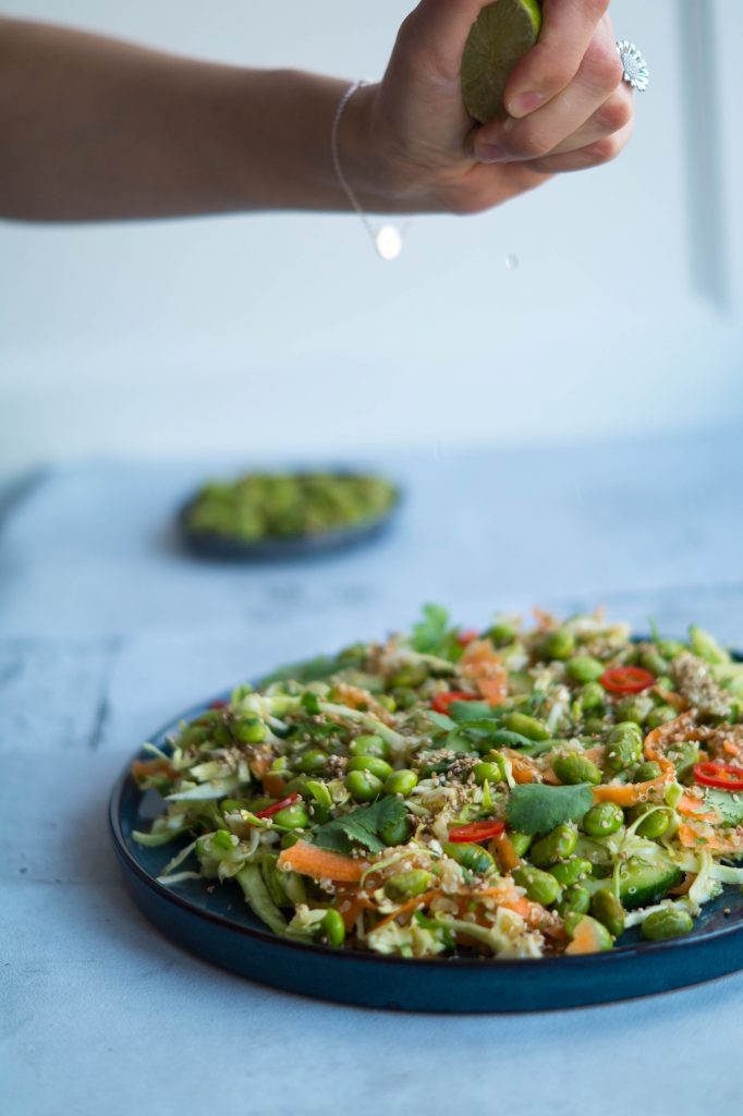 For et lille stykke tid siden lavede Stinna og jeg denne salat sammen til en frokost. Det var dog en dag hvor vi testede virkelig mange opskrifter af, hvorfor vi faktisk ikke var særlig sultne da denne salat kom på bordet. En skam, for den smagsprøve jeg snuppede var forrygende. Salaten er super frisk i smagen af godt med lime, ingefær og chili, og så mætter den godt pga. quinoa, kål og bønner. En salat som jeg helt sikkert skal lave snart igen, hvor jeg denne gang skal være godt sulten. Jeg foreslår at spise den sammen med falafler og denne dip.