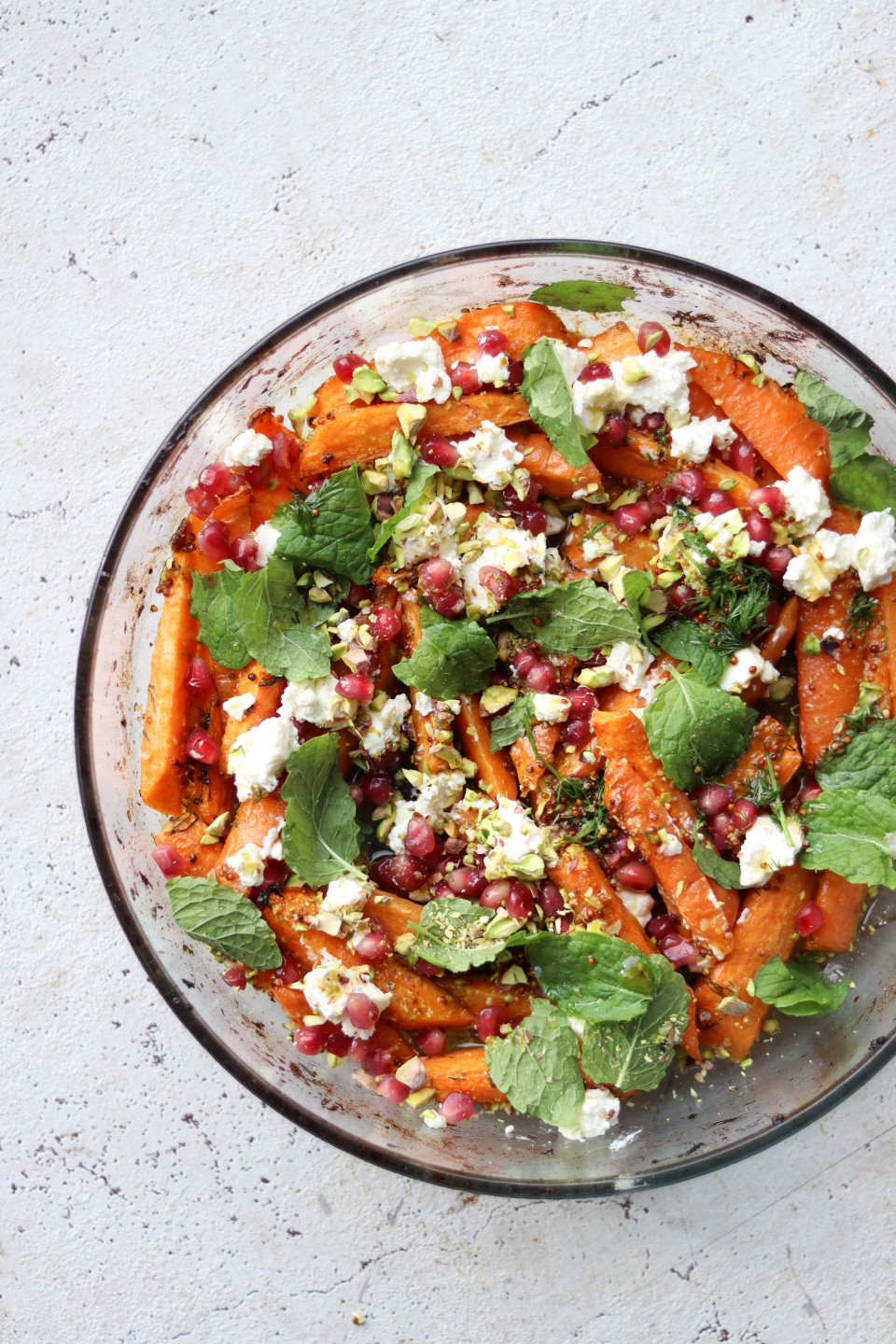 Her finder du lækre bagte gulerødder med pistacie, mynte og granatæble. En nem og smagfuld grøntsagsret, som er perfekt som tilbehør. Godt nok er det en mega simpel “side dish”, men jeg lover dig, at de ovnbagte gulerødder, der nærmest bliver karameliserede gør sig yderst godt med fetaen og de friske urter.