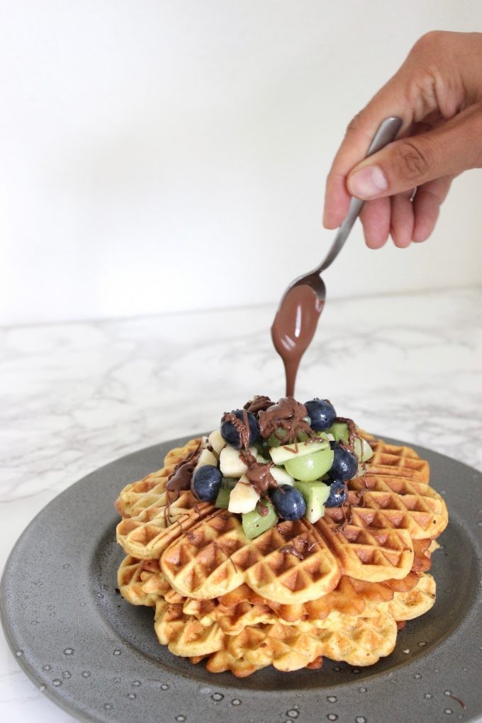 - Steg vaflerne i et vaffeljern i lidt olie eller smør. Jeg brugte kokosolie