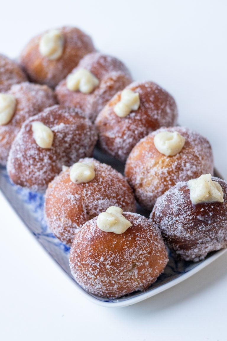 Hvis man vil prøve noget virkelig godt, så prøv dem her. En dejlig fedtet og blød berliner med et fyld af vaniljecreme. Vendt i sukker, så de bliver helt ægte berliner pfannkuchen style. De kan fyldes med alt muligt, men her er min udgave med en klassisk hjemmelavet vaniljecreme.