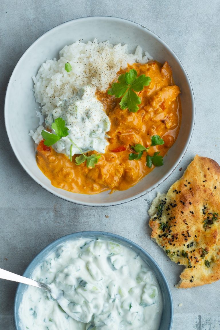 Her får I min version af chicken korma, serveret med ris, naanbrød og raita.