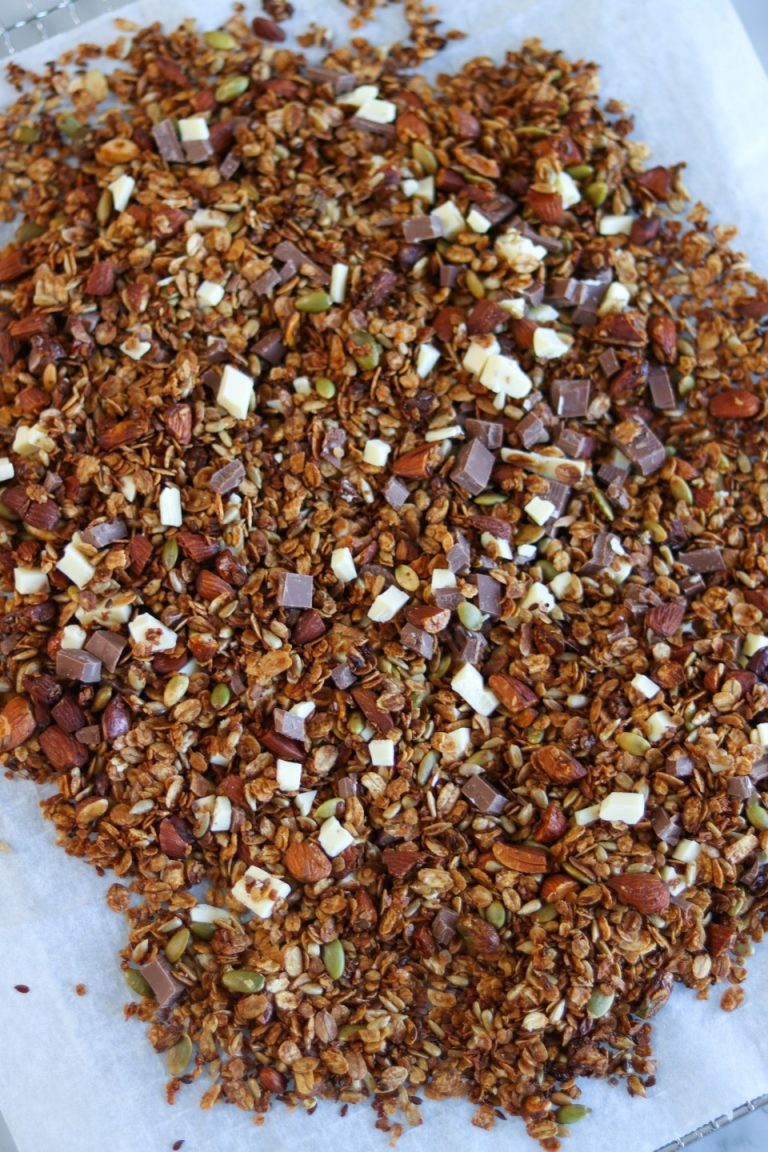 Jeg elsker altså sådan en portion hjemmelavet sprød granola. Den bliver jo heller ikke mindre god af at komme lidt chokolade i. Spis den med yoghurt, eller få andre idéer nedenfor.