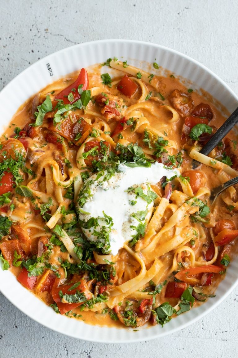 Hold da op en dejlig aftensmadspise, hvis jeg selv skal sige det. Denne her opskrift på cremet pasta med peberfrugtsauce er en nem omgang aftensmad for hele familien, som bare smager dejligt. Snup opskriften nedenfor – jeg håber den falder i jeres smag!