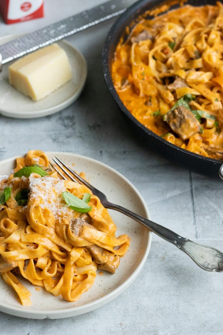 Cremet pastaret med flødesovs – en dejlig krydret en af slagsen og med skært oksekød og grøntsager.