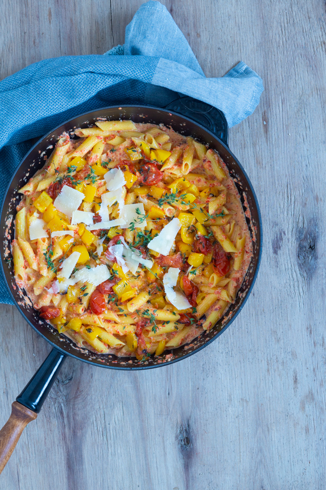 Her er en cremet pastaret med peberfrugtsauce. En lækker (somudgangspunkt) vegetarisk pastaret, som dog også sagtens kan serveres sammen med noget kød, hvis der er nogle kødspisere med til bords. Det endte vi med anden gang vi lavede den, og sådan kunne vi faktisk bedst lide den.