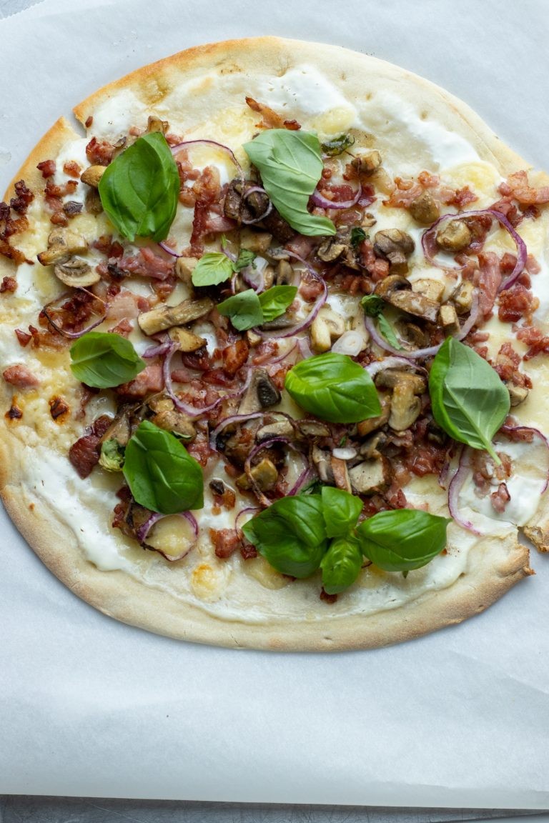 Hvis du vil lave din pizzadej selv, har jeg en opskrift her. Det bliver den bestemt ikke ringere af, men nogle gange må det også bare gerne være super nemt. Denne her pizza kan laves på 20 minutter i alt, og mens den er i ovnen – kan du jo smække en lækker tilbehørssalat sammen også. Jeg kommer med forslag nedenfor. Jeg har brugt lidt svampe også til fyldet, det kan sagtens undlades – men jeg synes det smager så godt. Men først får du opskriften på nem flammkuchen og en tilhørende video. Velbekomme