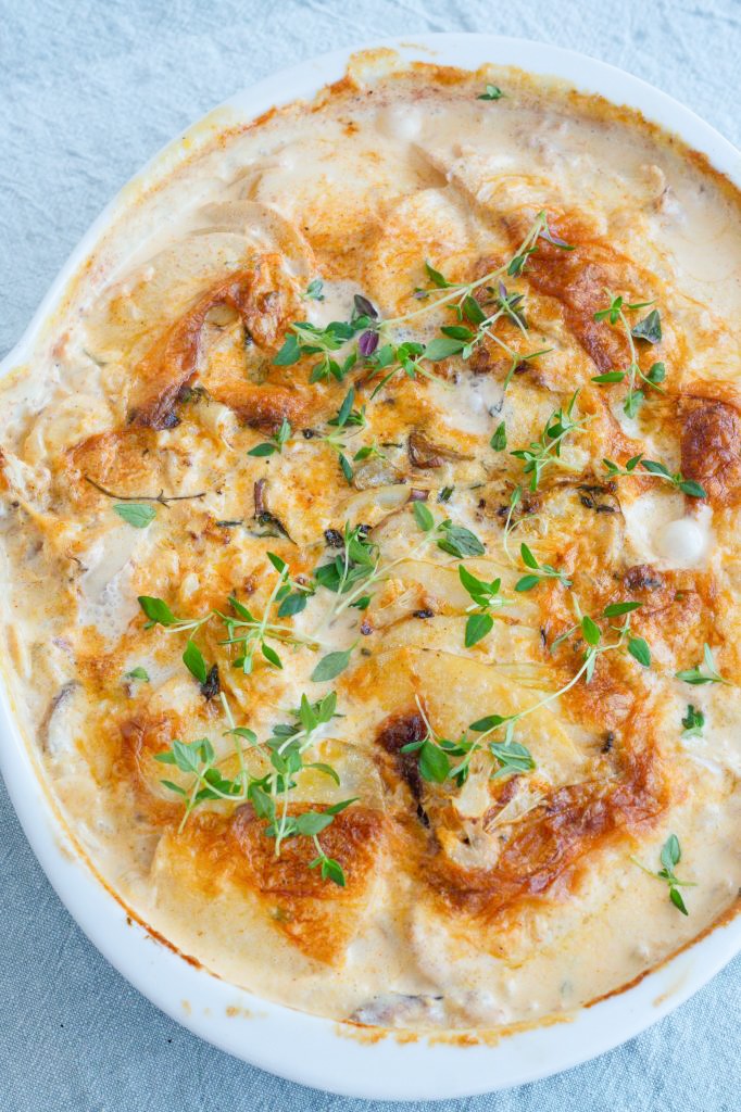 Det er super nemt. Man skal blot have en masse tynde skiver kartoffel i et ovnfast fad sammen med finthakket løg. Kartoflerne kan skæres i hånden eller de kan snittes på et mandolinjern. Så skal der en flødesauce over, som også indeholder krydderier. Du kan bruge paprika til din sauce, det gør jeg – det kan dog også undlades. Du kan tilsætte friske krydderurter eller lade være, jeg bruger frisk timian. En sidste idé, som du kan bruge eller lade være: blomkål. Jeg elsker det i retten, man skærer blot blomkål tyndt i hånden eller bruger et mandolinjern også. Det kan ikke sådan rigtig smages, mine børn eller mand har f.eks. aldrig sagt noget til det. Men det giver bare lidt et sundhedspust til retten, hvilket jeg synes komplicerer den ellers fede og lækre flødesovs.