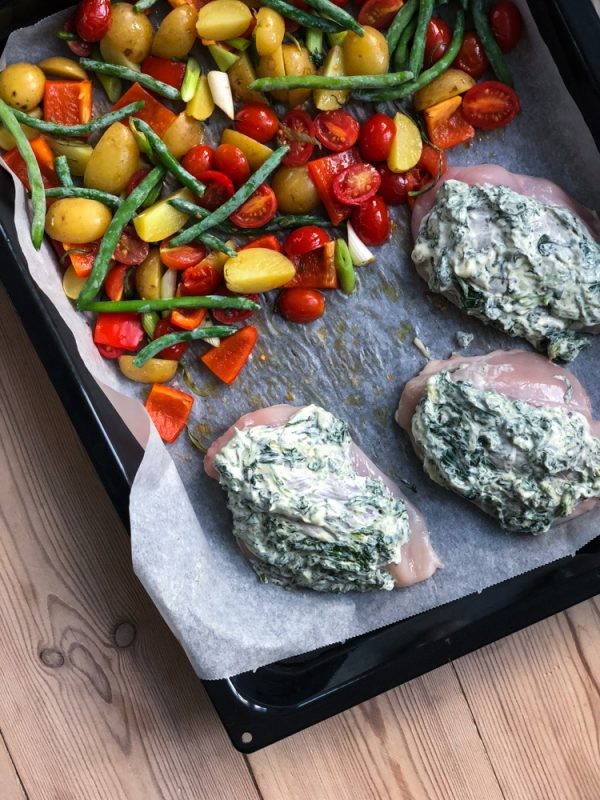 Fyldt kyllingebryst er en let hverdagsret som klares på et kvarter + lidt pas-dig-selv-i-ovnen-tid. Jeg er blevet ret vild med denne her måde at spise kylling på, da et kyllingebryst i sig selv måske er en smule kedeligt og tørt. Her har jeg skåret en lille lomme i brystet, som jeg har fyldt med cremen og kommet selv samme creme oven på inden de bages i ovnen. Det giver kyllingen masser af smag og fedme, og så passer det ret godt med en salat eller bagte grøntsager som her.