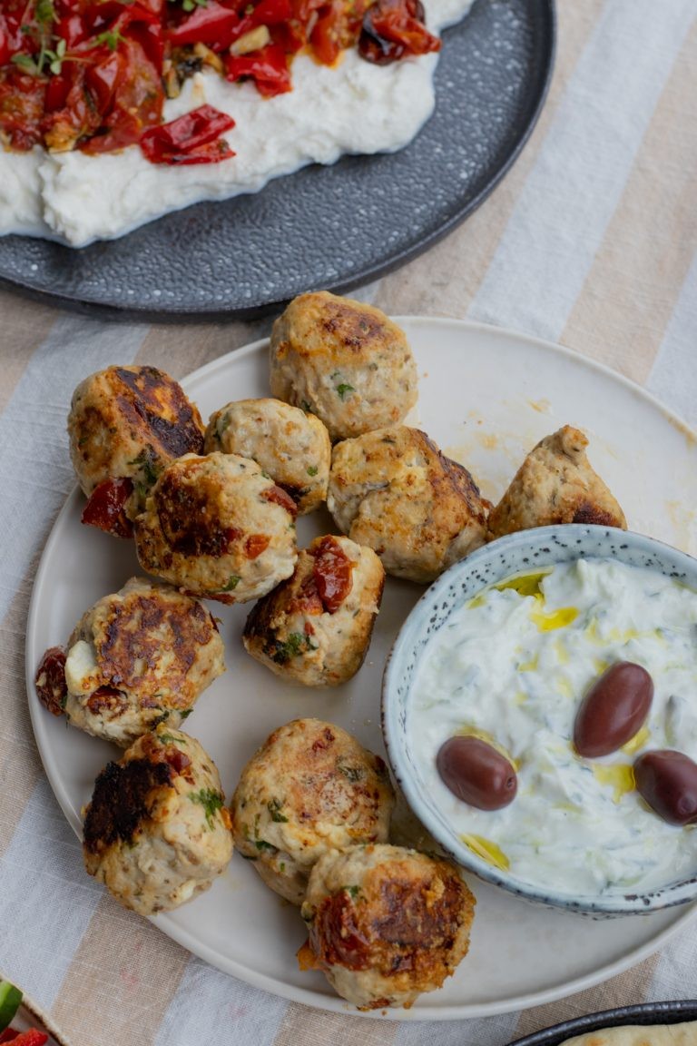 Græske frikadeller på hakket kyllingekød med fetaost, soltørret tomat og oregano. Her er et alternativ til de klassiske kyllingefrikadeller – nemlig en græsk udgave som smager nærmest endnu bedre. De er lige så nemme og hurtige at bikse sammen.