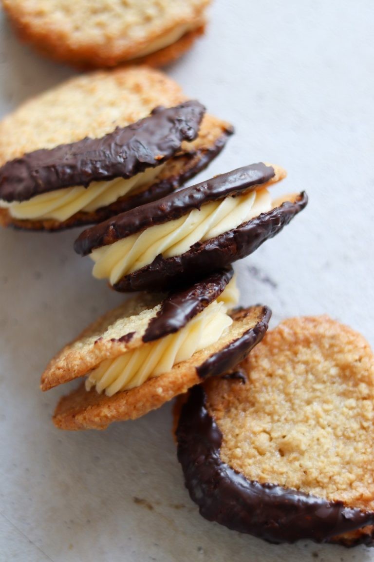 Havregrynskager med smørcreme og dyppet i mørk chokolade. En undervurderet spise, som måske nok er gået lidt af mode, men som ikke desto mindre stadig holder! De her havregrynskager er allerbedst, når de er blevet godt afbagt og har fået en let karamelliseret, sprød overflade. Og så er de lagt sammen med en blød og luftig smørcreme. Ikke så mange dikkedarer, men virkelig lækkert!