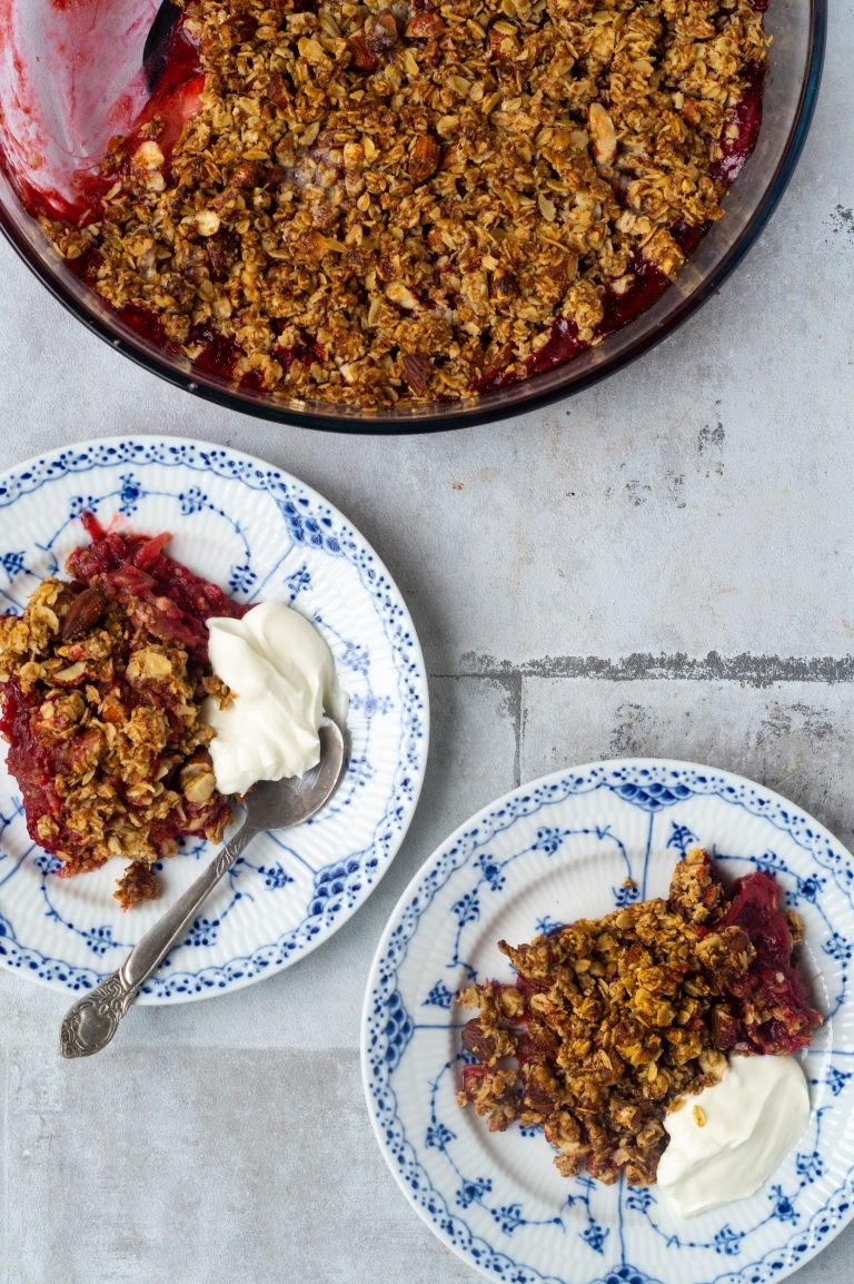 Se også min opskrift på æblecrumble, den er med marcipan, mandler og havregryn. Hvis du er vild med jordbær, så kig med på min klassiske jordbærtærte, min sundere jordbærtærte eller hvad med jordbær vendt i chokolade med hakkede hasselnødder – en virkelig fin ting at komme på kagebordet.