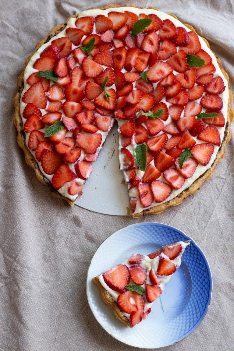 Jordbærtærte er min absolutte yndlingskage. Der er ligesom bare lidt af det hele. Min opskrift på jordbærtærte indeholder en sprød og smørfyldt mørdejsbund, en lækker marcipancreme, et tyndt lag mørk chokolade, en vaniljecreme og selvfølgelig en masse friske bær. Denne her tærte er virkelig nem, den indeholder få ingredienser og man kan stort set ikke lave fejl i opskriften, hvis man går med den købte vaniljecreme. Jeg deler også lige en hjemmelavet creme, hvis man foretrækker det. Det smager bedst, men er lidt sværere og mere tidskrævende. Håber I kan bruge min jordbærtærte opskrift