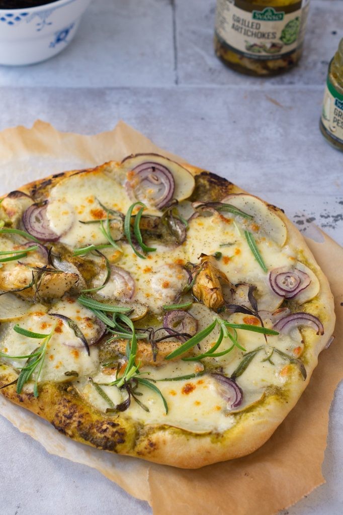 Her er min bedste opskrift på en virkelig nem kartoffelpizza med pesto. Jeg har bagt bunden selv, da det klart giver det beste resultat. Denne har jeg smurt med grøn basilikumspesto fra Svansø og efterfølgende lagt tynde skiver kartoffel, rødløg, mozzarella og frisk rosmarin på. Jeg har desuden brugt lidt af de her grillede artiskokker fra Svansø også og det giver et dejligt twist til pizzaen. Jeg håber I har lys til at prøve min opskrift af på en hjemmelavet hvid pizza, eller grøn er den nok nærmere. Den er i hvert fald ikke rød, som de klassiske tomatsauce-pizzaer. Her er nok til 2 pizzaer.