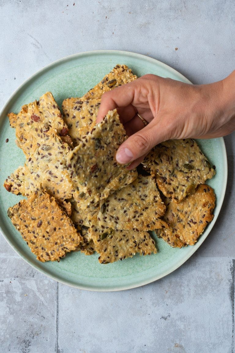 Der er lidt hvedemel og havregryn i knækbrødet her, så dette er ikke glutenfrit. Men du kan sagtens skifte havregrynene ud til en glutenfri version. Jeg har ikke selv prøvet at ændre hvedemelet til rismel eller sorghummel. Men jeg tænker dog sagtens, det kan lade sig gøre – så man får et glutenfrit knækbrød.
