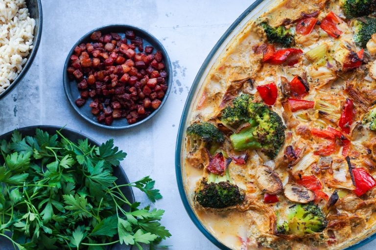 Ja du kan også servere den med bagte blomkål. Det gør vi også nogle gange, eller med begge dele (både ris og blomkål). Men hvis det kun er med blomkål som tilbehør, skruer jeg ned for grøntsagsmængden i selve retten, evt. undlader broccolien. Ellers kan man servere den med couscous eller bulgur.