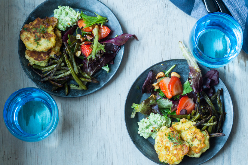 Vi spiste vores kyllingedeller sammen med denne jordbærsalat, denne ærtedip og bønnefritter. Sundt, mættende og skønt sommermad. Ift. bønnefritterne, hældte jeg blot en pose grønne bønner på en bageplade beklædt med bagepapir, kom lidt olie, salt og peber over, og bagte dem ved 225 grader i 20 minutters tid.