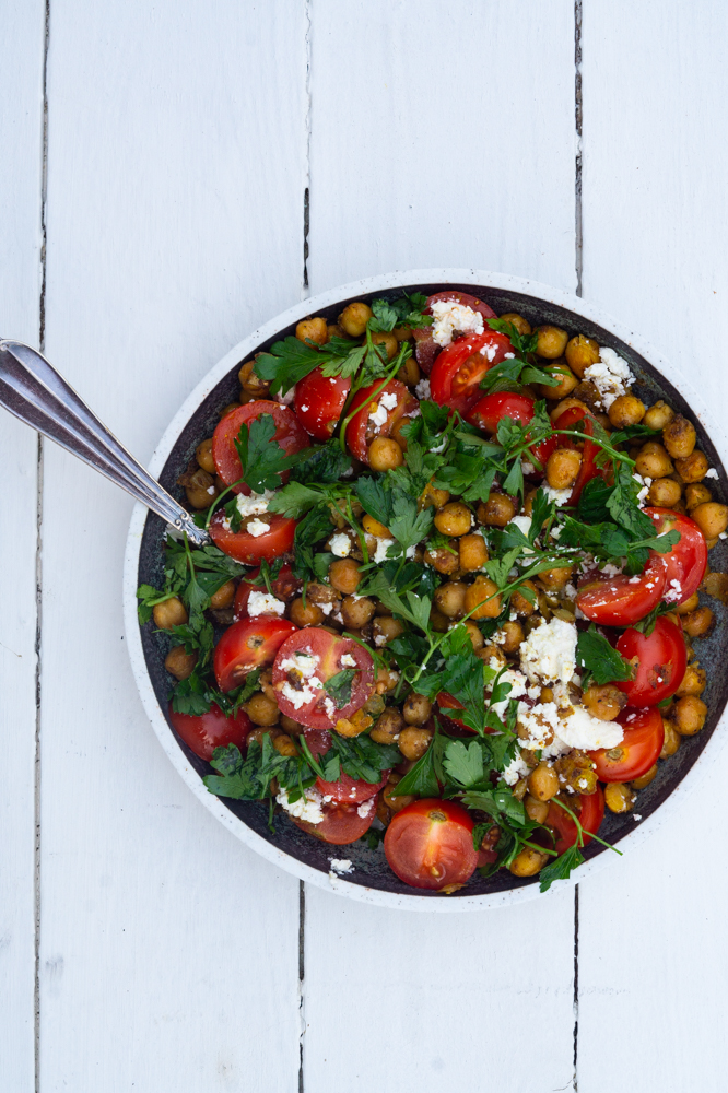 〈 KIKÆRTESALAT BESTÅENDE AF RISTEDE KIKÆRTER I FAVORITKRYDDERIER, FETA, CHERRYTOMATER OG BREDBLADET PERSILLE 〉
