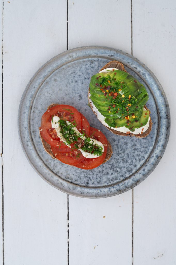 〈 RUGBRØD MED TOMAT, MAYO, PURLØG, AFSKALLEDE HAMPEFRØ OG FLAGESALT & ÈN MED FLØDEOST, AVOCADO, PURLØG, FLAGESALT OG CHILIFLAGER 〉