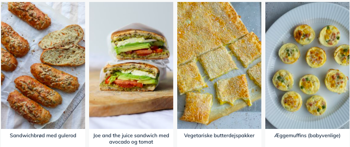 - Pizzasnegle, Pølsehorn, Frokostmuffins, Grøntsagsvafler, Pandekager (alm., spinat eller banan), Kødboller/frikadeller, Små tærter, Diverse snacks, barer, kugler osv.