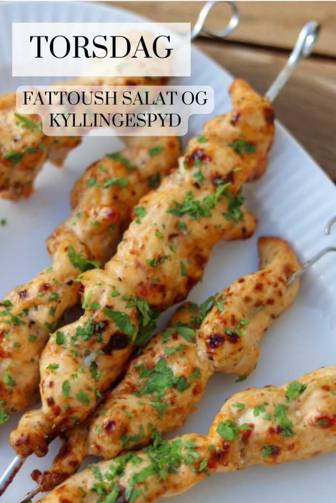 Torsdag: Fattoush salat, server med de her kyllingespyd. Den salat, jeg linker til indeholder ikke grillost – men det er vildt lækkert. Så det vil jeg anbefale, og jeg har sat det på indkøbslisten. Brug desuden blot det samme brød som dine toast.