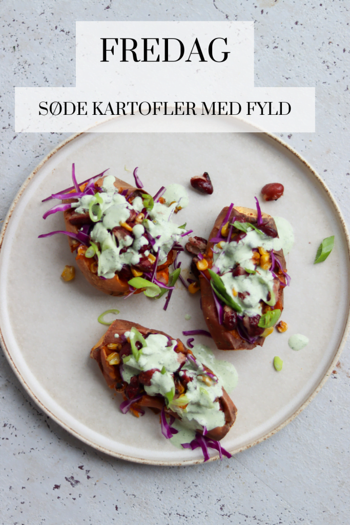 Fredag skal der kreeres de her bagte søde kartofler med det lækreste vegetariske fyld og en grøn urtedressing på toppen. I fyldet er der blandt andet lidt lilla spidskål, ærter, kidneybønner og forårsløg.