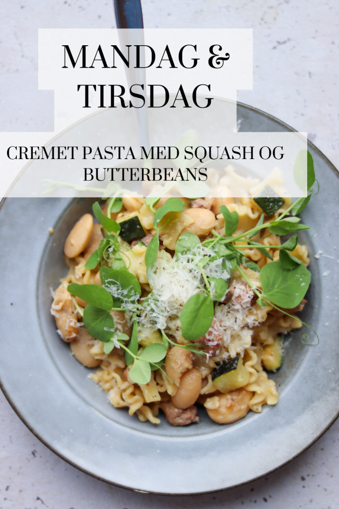 Mandag kan du glæde dig til denne cremede pastaret med butterbeans og salsiccia. Der er masser af squash, citronskal, primadonna ost og andet godt i. Lav gerne dobbeltportion, så du har nok til tirsdag også. Hvis du synes, kan du sagtens tilføje spinat, grønne bønner eller ærter til retten også.