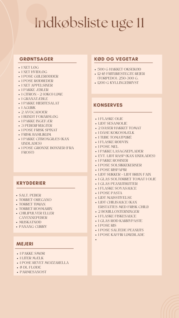 Madplanen er lavet til en familie med 2 voksne og 2 børn. Så har I flere og/eller ældre børn, skal der måske handles og laves en anelse mere nogle af dagene. Du kan kigge indkøbslisten igennem og selv vurdere mængderne. Det kan også være, I ikke har børn, så er der lidt ekstra til madpakkerne dagen efter i stedet. Der er garanti for god næring, samt masser af forskellige smage og teksturer. Hav en dejlig uge 11.