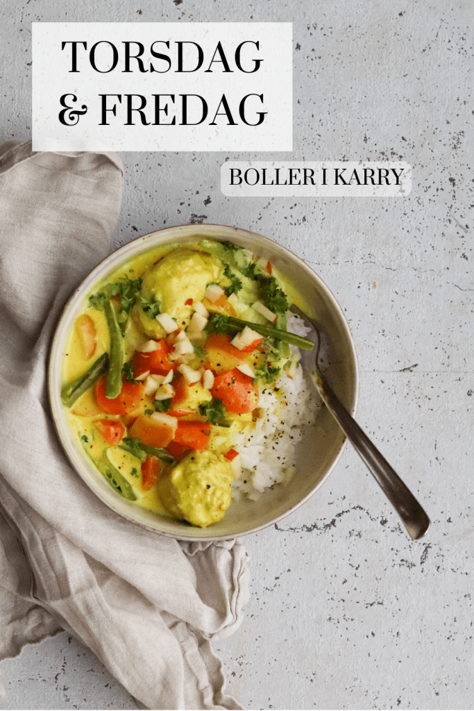 Torsdag og igen rester fredag: her kan du finde en klassisk og børnevenlig omgang boller i karry. Jeg har kommet lidt grøntsager i min version, fordi jeg elsker grøntsager og gerne vil “helse den lidt op”. Du kan servere diverse toppings til også, hvis du synes – rosiner, peanuts, mango, banan, kokos mm.