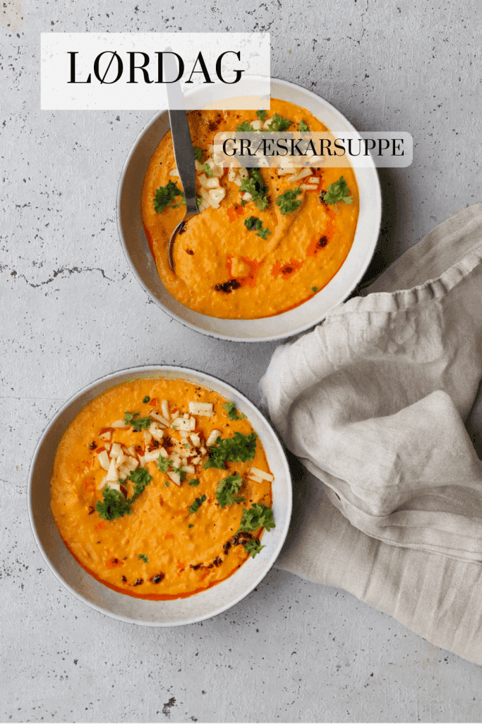 Lørdag er der en omgang græskarsuppe på menuen med karamelliserede græskar, flødeost og sambal oelek. Du kan enten blende alle græskar ud i suppen (som på billedet her.) Eller gemme lidt, som du ikke blender – men i stedet serverer til (det har jeg gjort på den der er linket til)