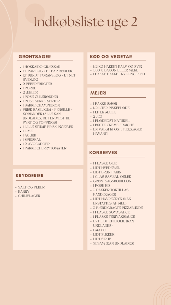 Madplanen rækker til 4 personer og byder på nemme hverdagsretter for hele familien samt en indkøbsliste, som ligger nederst i indlægget. Her er udvalgt nogle børnevenlige retter, som kan laves i store portioner. Jeg linker til de forskellige retter, kommer med serveringsforslag samt forslag til hvordan du kan genbruge. Så finder du en video, hvor du lige kan se om madplan uge 1 kunne være noget for dig. Og så er der indkøbslisten, som er sorteret og indeholder alt det du skal bruge til alle ugens dage.