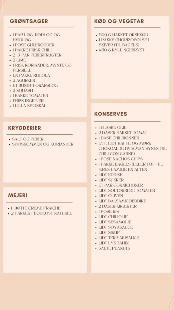 Mange af tingene på listen skal kun bruges i små mængder. Især det der står under konserves. Så tjek lige dit lager inden du hopper afsted mod supermarkedet.