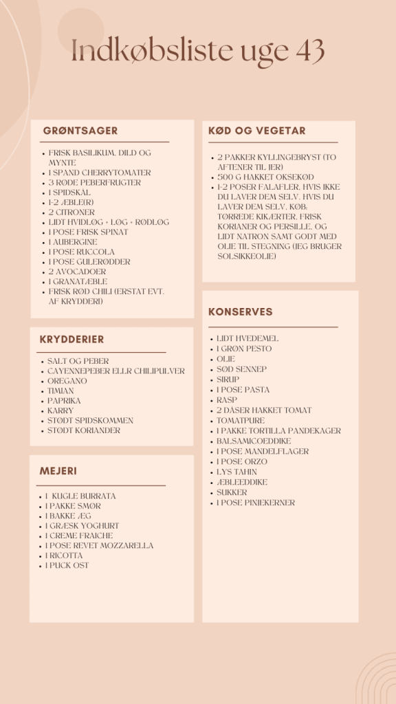 Her får du en madplan til uge 43, hvor der venter jer en uge med grønne, nemme hverdagsretter – og vaskeægte familiefavoritter. I denne uge kan man glæde sig til lækre fyldige salater, et alt i et fad, tærte og mellemøstligt. Lad dig inspirere af nogle af retterne eller snup dem alle og følg hele madplanen. Hvis du tager det hele, så har jeg lavet en indkøbsliste, der passer hertil.