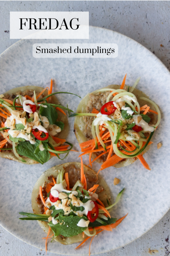 Find opskriften på smashed dumplings lige her. Hvis du synes, kan det hakkede svinekød sagtens skiftes ud med hakket kyllingefars i stedet.