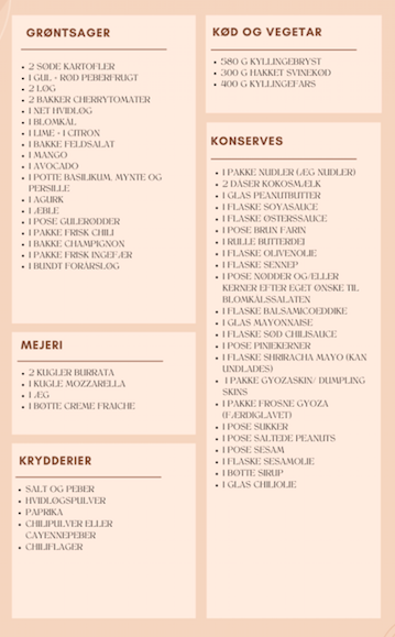 Madplanen rækker til 4 personer. Mandagsretten er til 8, så den er planlagt til to dage. Varm blot herligheden op igen tirsdag. Der er ingen kød i nudelretten, så der er lige et par vegetariske dage her. Onsdag finder du de butterdejstærter som kan serveres sammen med en mangosalat – igen et bud på en vegerarisk dag. Torsdag er der smagfulde kyllingespyd serveret med et humusfad med hvidløgsbagte tomater. Fredag smashed dumplings med svinekød og lørdag en omgang asiatiske kyllingefrikadeller med en blomkålssalat.