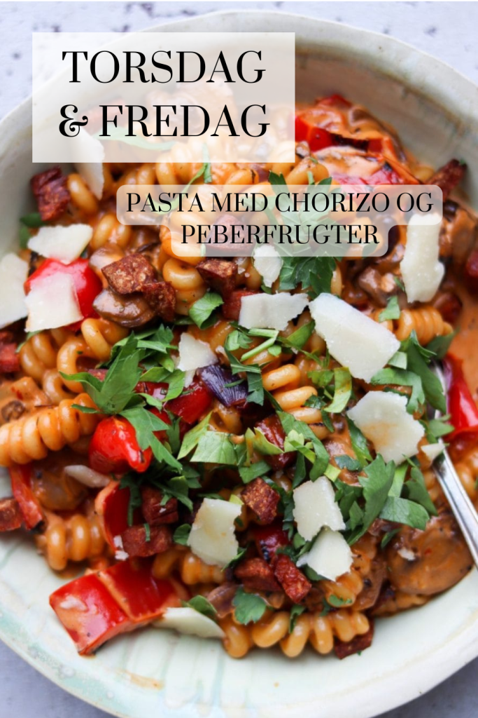 Torsdag og fredag er der en lækker cremet pastaret på planen. Den indeholder sprød chorizopølse, peberfrugter og en tomatsauce. Top med høvlet parmesan og friske urter. Lav gerne dobbeltportion torsdag, så du har til begge dage.