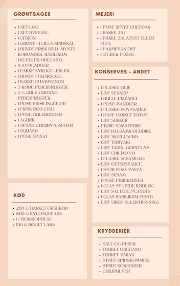 Søndag: Rester fra ugen, hvis du har mere tilbage. Få tømt ud i køleskabet, så du er klar til en ny uge.