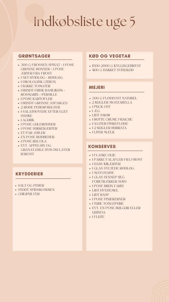 Her finder du min madplan uge 5, hvor du kan glæde dig til at servere og nyde kyllingenuggets, rødbedesalat med burrata, fyldte kyllingebryst, caprese, karbonader og en salat med falafler og bagt feta. Mums, jeg synes det er nogle lækre retter! 2 af dem rækker til to dage og søndag er som altid restedag. Hav en dejlig uge 25.