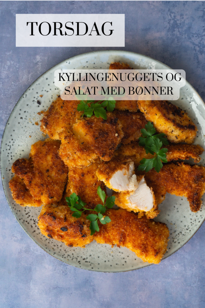 Torsdag: Skal I have hjemmelavede kyllingenuggets (lav dobbeltportion) sammen med resterne af ingredienserne, du brugte til onsdagens salat. Freestyle en salat ud af bønner, peberfrugt, salat, løg og feta – og ristede kikærter, hvis du har flere. Du kan evt. anrette det på en bund af kogt bulgur, quinoa eller lignende for mere fylde. En anden idé er at lave noget råkost, f.eks. ud af revet gulerod, rødbede og æble. Pres gerne appelsinsaft over eller kom granatæblekerner over.