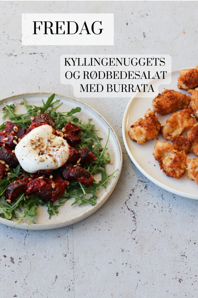 Fredag: Servér i dag resterne af torsdagens hjemmelavede kyllingenuggets sammen med en salat med bagte rødbeder og burrata. Skær også lidt gnavegrønt og varm et flute – det har jeg beregnet i indkøbslisten.