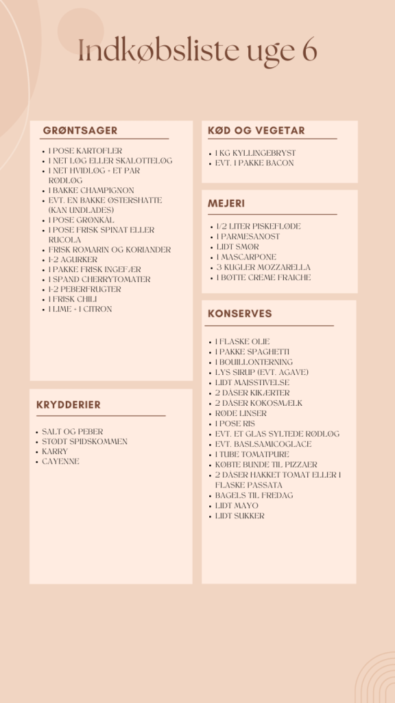 Indkøbsliste til madplan uge 6