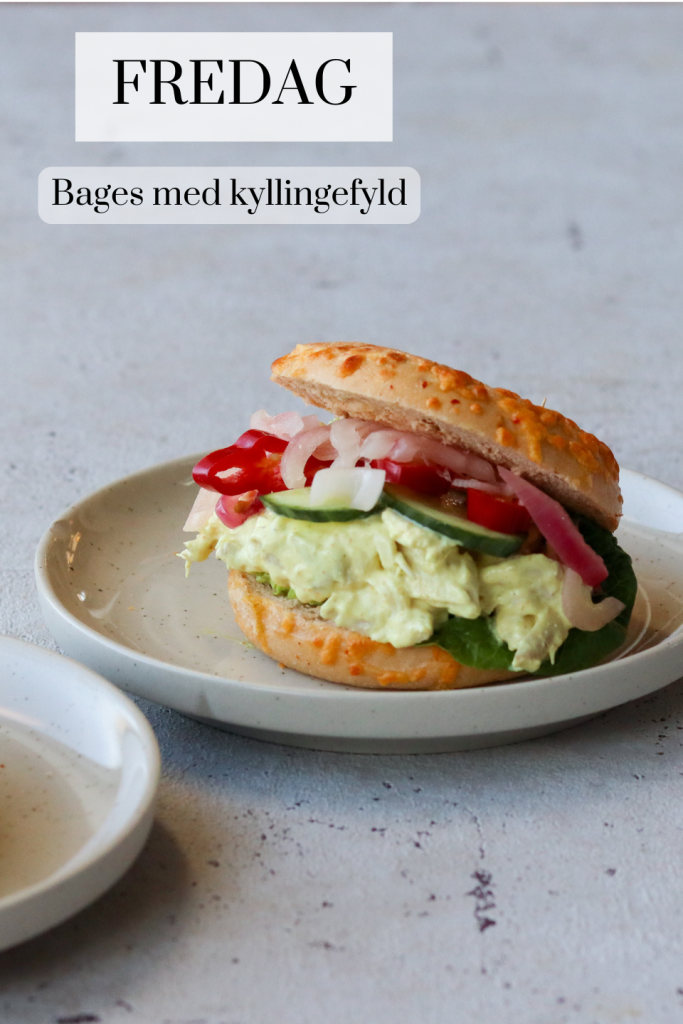 Fredag: bagels med kylling i karrydressing. Det smager også virkelig skønt, server gerne med syltede rødløg også. Gør det nemt, køb dine bagels. Fyldet rækker til en del, så brug resterne i morgen.