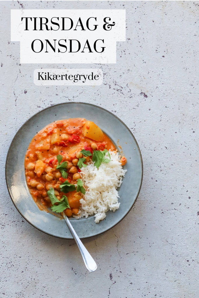 Tirsdag (og rester onsdag): Her kan du glæde dig til en virkelig god vegetarisk gryderet. Det er den jeg har linket til, bare hvor jeg skiftede græskar ud med kartofler. Du kan evt. lade være med at købe spinat og i stedet bruge grønkål-resterne. Jeg elsker denne her ret! Og lav gerne ekstra, så du har nok til begge dage.
