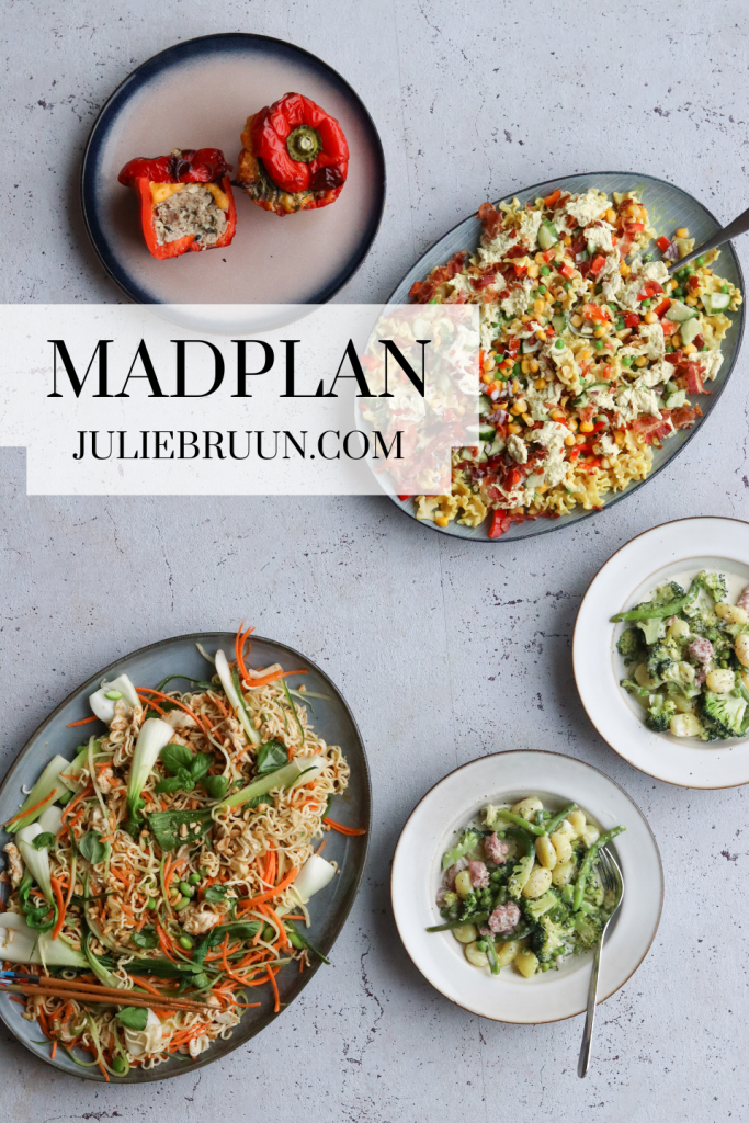 Her får du en madplan til uge 7, hvor der venter jer en uge med nemme, grønne, hverdagsretter. I uge 7 kan du glæde dig til pastasalat med karrydressing, kylling og bacon, fyldte peberfrugter med kartofler og gnavegrønt, gnocchi med salsiccia og broccoli og nudeelsalat med peanutdressing. Hvis du tager det hele, så har jeg lavet en indkøbsliste, der passer hertil. Du finder den nederst i indlægget her.