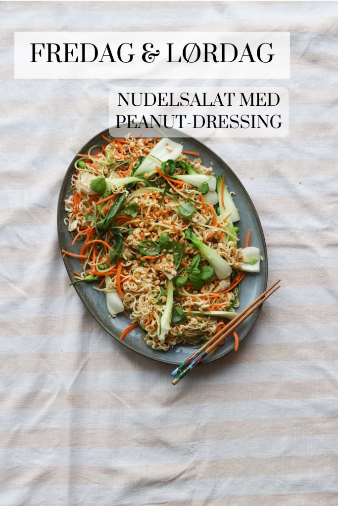 Fredag og lørdag kan du glæde dig til en nudelsalat. Den serveres fredag med de her asiatiske kyllingedeller. Lørdag kan du lave dig en omgang kyllingenuggets til. Nudelsalaten består af nudler, gulerod, pak choi, frisk basilikum, saltede peanuts, edamammebønner og agurk samt denne dressing. Man kan bruge et juliennejern til grøntsagerne, for at få sådanne strimler frem.