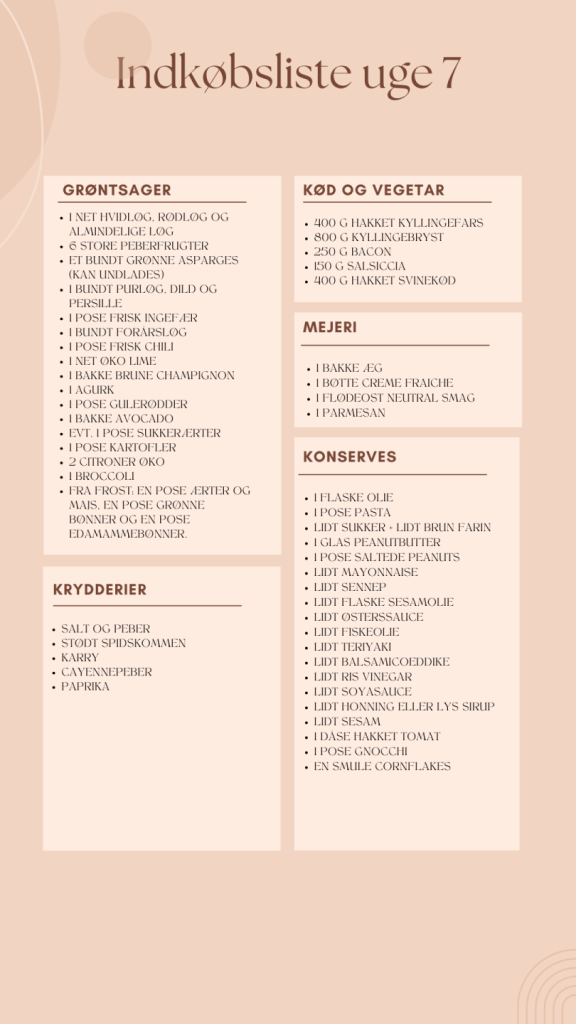 Madplanen er lavet til en familie med 2 voksne og 2 børn. Så har I flere og/eller ældre børn, skal der måske handles og laves en anelse mere nogle af dagene – kig indkøbslisten igennem og vurdér selv. Det kan også være I ikke har børn, så er der lidt ekstra til madpakkerne dagen efter. Jeg håber, madplanen kan bruges. Der er garanti for god næring, samt masser af forskellige smage og teksturer. Hav en dejlig uge 7.