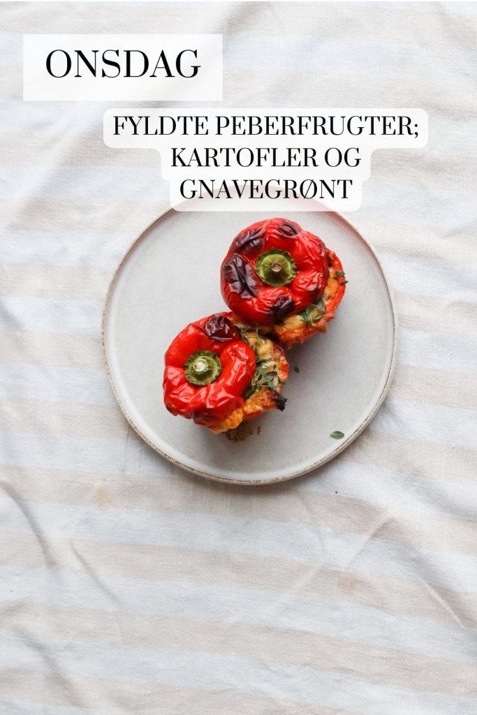 Onsdag finder du fyldte peberfrugter som serveres med patatas bravas (kartofler med tomatsauce og hvidløgsdressing) + lidt gnavegrønt (agurk, gulerod, avocado og sukkerærter f.eks.) – Jeg skærer toppen af peberfrugter og udhuler dem. Fylder dem med denne fars + en håndfuld revet cheddar til hver. Så bages de i ovnen i en lille halv time.