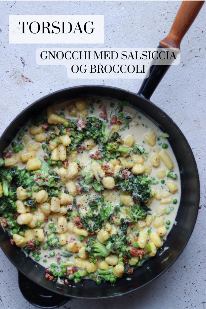 Torsdag er der denne gnocchi ret på menuen. Men dog med salsiccia frem for bacon og så har jeg tilføjet 150 g grønne bønner også.