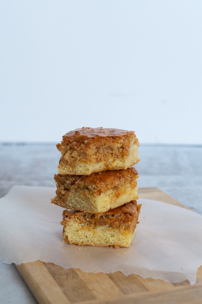 Jeg må sige at denne makronkage har taget bradepandekagen til nye højder. En bradepandekage tænkte jeg måske som værende en lille bitte smule kedelig. Men det er absolut ikke et udtryk man kan bruge om kagen her. Den er kompakt, fedtet, konfektagtig og sød – med en marcipanagtig smag.