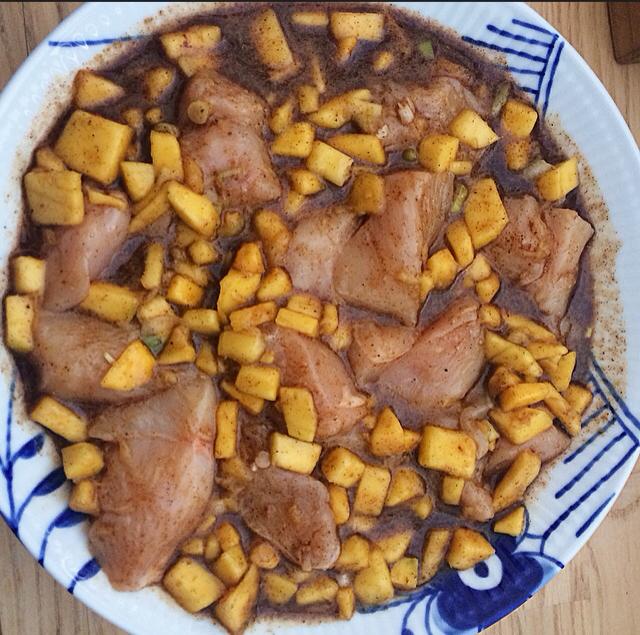 Her er en opskrift på en slags marinade, som jeg ofte bruger sammen med kylling. Den består bla. af mango, ingefær, hvidløg og forårsløg. Der ud over har jeg brugt olie, honning og godt med krydderi. Det hele blandes sammen og bruges f.eks. sammen med kylling. Det giver den bedste smag af noget krydret, noget sødt og noget syrligt. Det hele steges eller bages i ovnen og serveres som du synes. Nogle gange får vi ris til, andre gange bruger jeg det mere som et fyld i f.eks. sandwich som her, eller i madpakkekager.